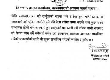 काठमाडौं । भारत स्थित उत्तराखण्डको पिथौरागढ जिल्लाको मालपास्थित महाकाली नदीमा रहेको ताल फुट्ने सम्भावना रहेको भन्दै सरकारले ‘अलर्ट’ ज ...